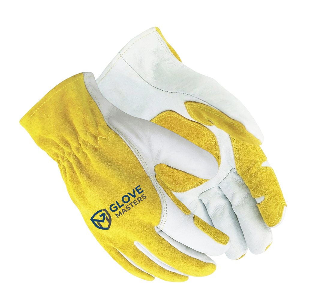 Premium cow grain leather glove with triple‑zone reinforcement on thumb, index, and palm, ergonomic wing thumb design, secure shirred elastic back, and self‑hem finish