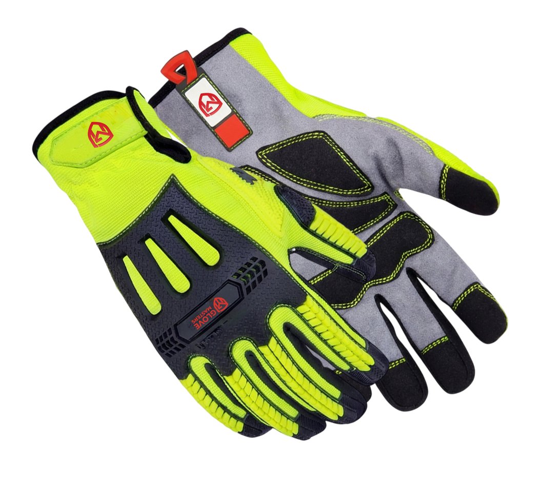 - Anatomically mapped Thermoplastic Rubber guards in a striking Black and Hi-Viz Yellow design are precision-welded across the knuckles to defend against crushing forces.